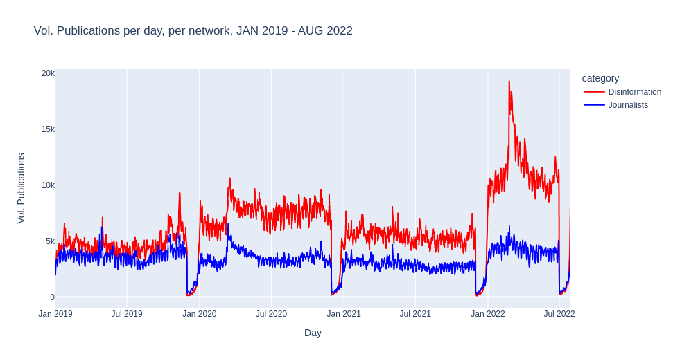 Durante eventos sociales significativos, como el inicio de la pandemia por COVID-19 o la guerra en Ucrania, las redes de desinformación aumentaron considerablemente su actividad, lo cual tiene especial sentido y es un indicador claro de coordinación y de intención. Las Redes de Desinformación tienen una intención, existen para un fin, y se activan especialmente durante crisis con el objetivo de aprovecharse de estas para instalar una narrativa y/o polarizar a la población. Esta hipótesis se alinea especialmente con los ataques llevados a cabo por actores estatales (pensemos en el contexto del conflicto entre EEUU/UE, Rusia y China). Las publicaciones en estas redes mostraron: