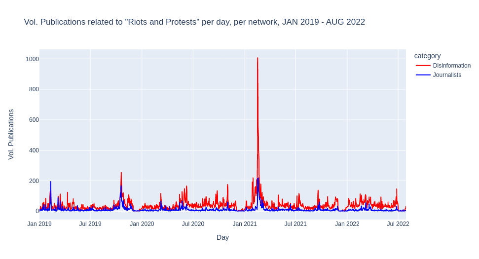 Vemos también que las redes de desinformación presentan un patrón anormalmente alto durante eventos como protestas y disturbios. En la imagen que podéis ver a continuación, apreciamos un pico de actividad durante las protestas por la detención del rapero español Pablo Hásel.