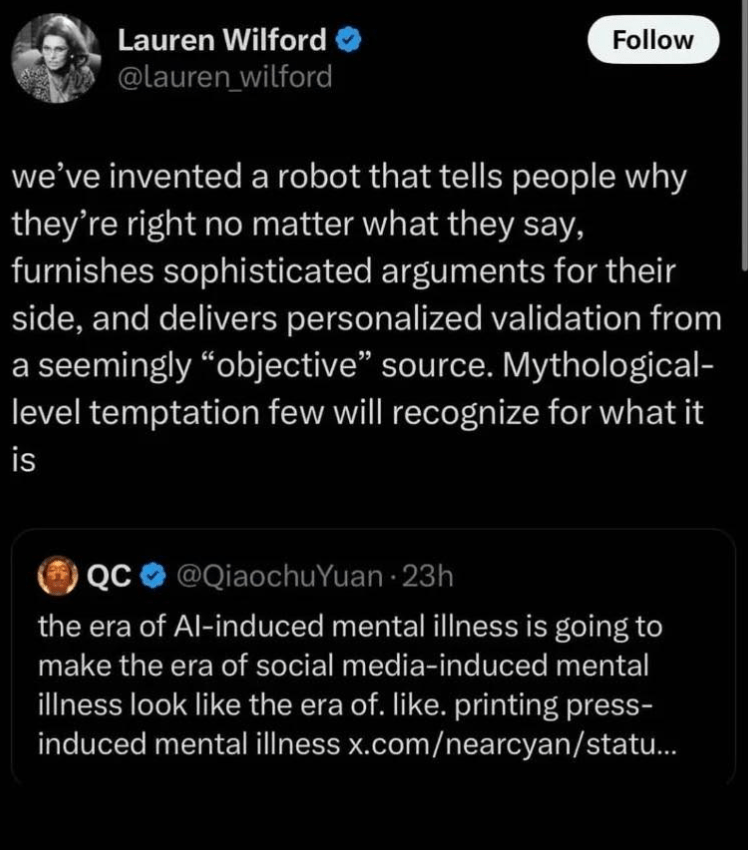Si lo llevamos al nivel del individuo, ahora convertido en usuario, podremos observar cómo la delegación del proceso cognitivo irá más allá de la mera tarea, trasladándose —como ya estamos viendo— en una delegación emocional y social, en la cual muchos humanos caen presos, aislándose de su entorno o comiendo todo tipo de locuras por indicación de una máquina que siempre busca darnos la razón. Dejamos de existir poco a poco.